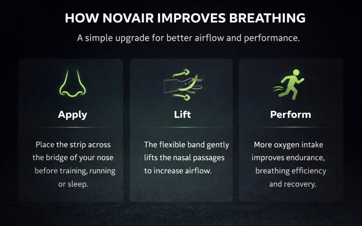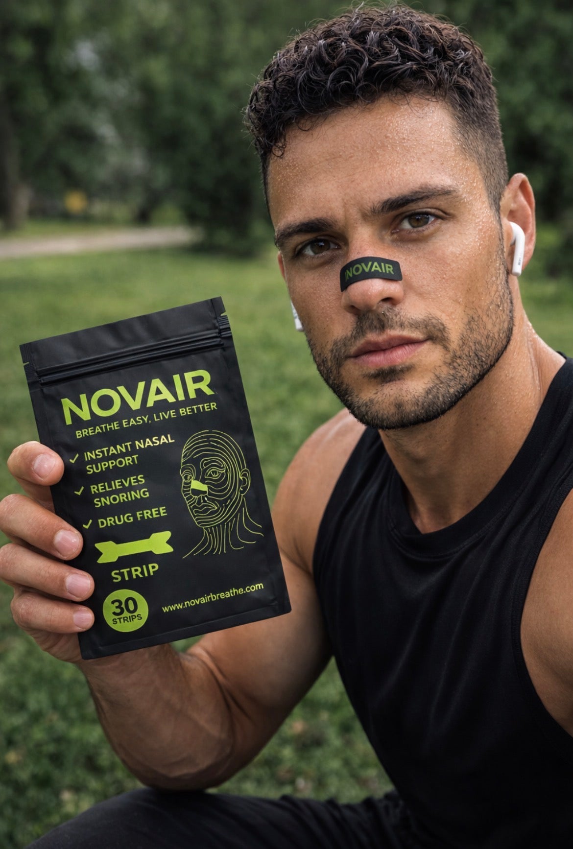 NovAir strips gently lift the nasal passages to support better airflow through the nose. this can help improve breathing during sleep, endurance, recovery, and everyday activities.